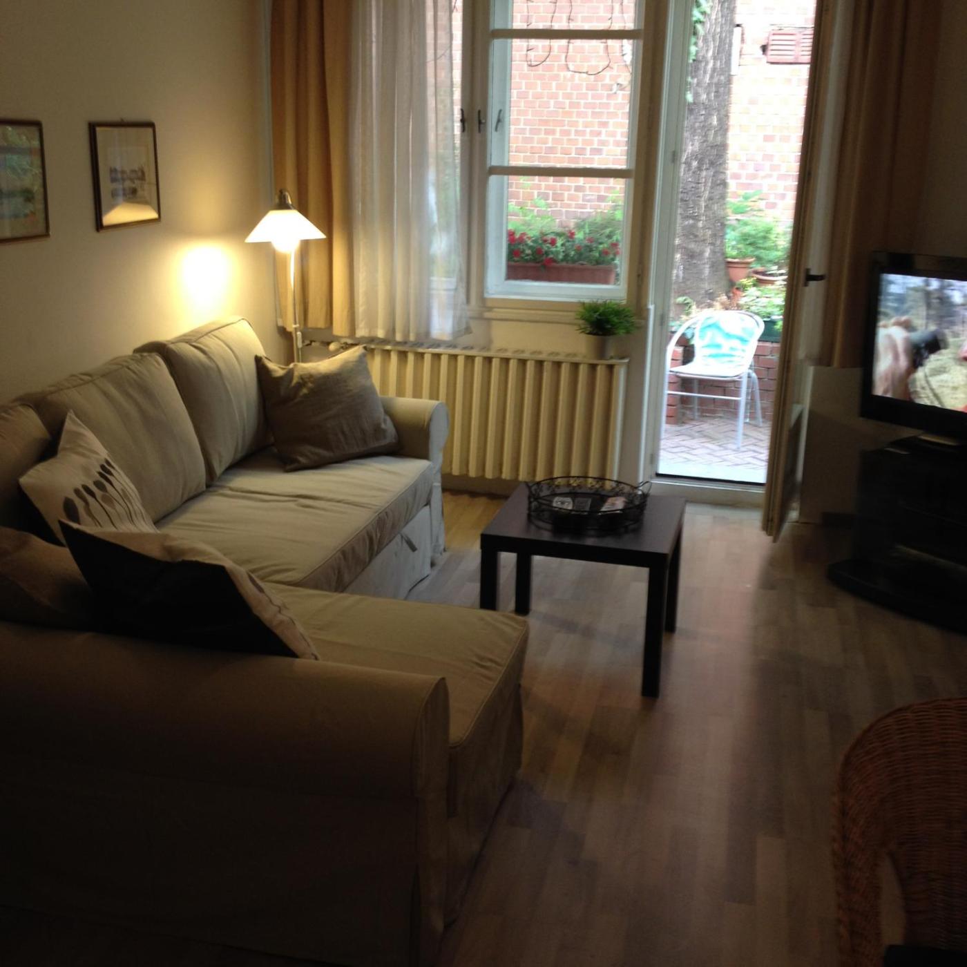 One-Bedroom Apartment. This ground-floor apartment is decorated with elements from Art Deco style, and features: - a balcony overlooking thegarden - a bedroom with 2 single beds - a living room with a sofa bed, a flat-screen cable TV - a spacious and well-equipped kitchen with a dining table - a high chair is available for a child - cleaning products, ironing facility, a hairdryer and an alarm clock are also provided - a bathroom with a shower - a baby cot is available on request